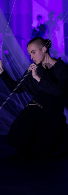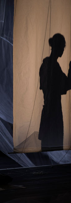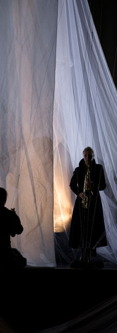 Dreamlike vision of the Being and its Shadow, the performance stages the musician and its double, who evolve on stage in an evolutionary set of transparent veils. Emmanuel Michaud, like a boatman or a puppeteer, gives life to the pieces of the veiled fabrics and draws new forms, creating games of shadows and light and underlining the scenic action. He is the Shout, shade of the saxophonist. At first discreet, the virtual character gets the upper hand little by little over its real envelope, until this one, embodied by the saxophonist, quite loses control that she practiced on him. Enigmatic rite, mysterious procession, the route ends on a paroxystic image in a saturated and unstructured landscape where shadows and characters do not distinguish themselves any more.